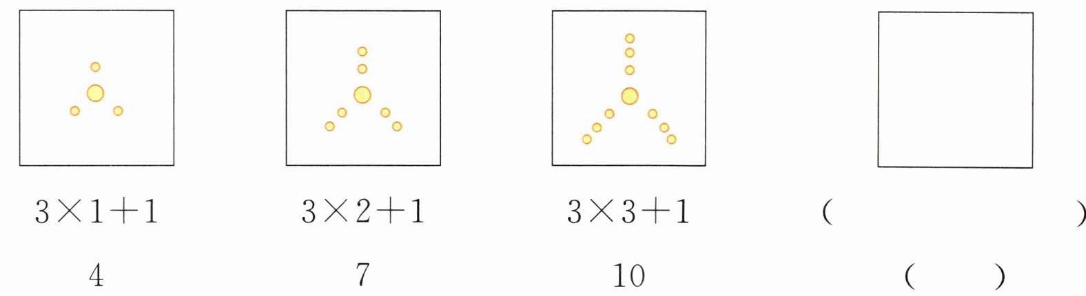 画一画略 3×4+1 13 解析 观察图形,每个图形中心都有1个大的点。第一个图形:向3面各发散1个点;第二个图形:向3面各发散2个点;第三个图形:向3面各发散3个点。按照规律,第四个图形应向3面各发散4个点。求第四个图形中一共有几个点,也就是求3个4相加再加1是多少,列式为3×4+1=13。