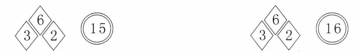 解析:解决此类问题,需要根据每个算式的得数,把2、3、6这三个数组合,运用“+”“−”“×”这三种运算符号尝试推算。2×3=6,离15、16都相差较大。2×6=12,和15正好相差3,第1个算式为2×6+3=15。3×6=18,和16正好相差2,第2个算式为3×6−2=16。