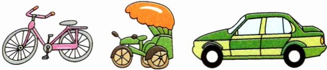 3. 如图,每辆自行车要装2个轮子,每辆三轮车要装3个轮子,每辆小轿车要装4个轮子。