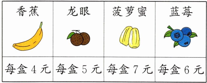 | 香蕉每盒4元 | 龙眼每盒5元 | 菠萝蜜每盒7元 | 蓝莓每盒6元 |