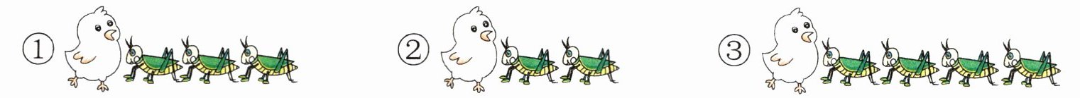 4. 要把下面这些虫子平均分给3只小鸡,应从( )号小鸡处拿走( )只虫子放在( )号小鸡处。