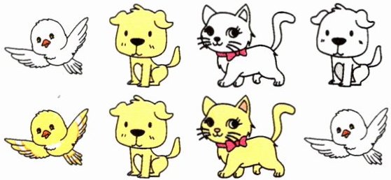 (2)可以继续按颜色分,小猫、小狗、小鸟都可以分为白色和黄色。