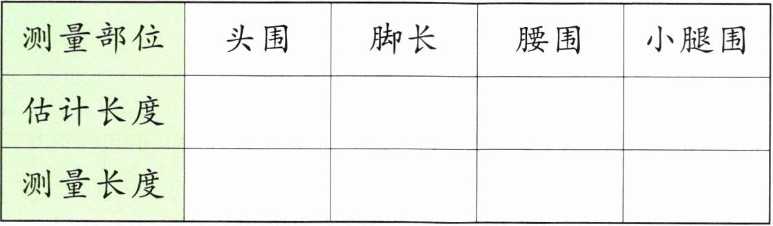 解析:本题主要考查对长度的估算以及实际测量能力,需要用到尺子等测量工具,先根据生活经验对头围、脚长、腰围、小腿围进行估算并填写,再用尺子准确测量并记录数据。