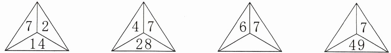 42 7 解析 观察前两组数可以发现:7×2=14,4×7=28,即上面两个数相乘得到下面的数。根据发现的规律可求出后面两组要填的数。第三组,6×7=42,所以填42。第四组,( )×7=49,想乘法口诀“七七四十九”,可推出( )里面填7。