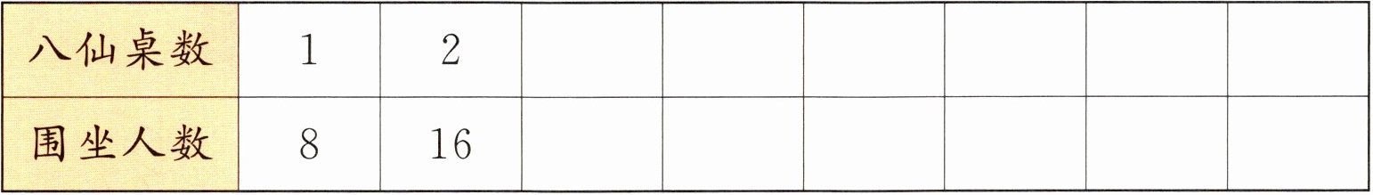 4. 八仙桌是中华民族传统家具之一。一张八仙桌可以围坐8人,2张八仙桌可以围坐16人,3张、4张……八仙桌可以围坐多少人?填一填。
