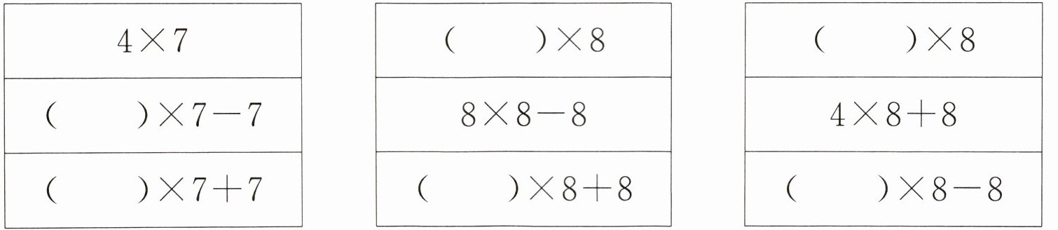5 3 7 6 5 6 解析 由题目可知,每组算式的得数相等,可以根据乘法的意义推算出括号里应填的数。4×7可以表示4个7相加,它比5个7少1个7,比3个7多1个7,可写成算式5×7-7,3×7+7。其他同理可得。