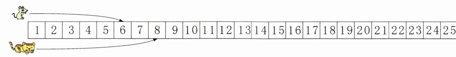 解析 求它们在哪格可以相遇,就是求几个6与几个8的得数相等。“四六二十四”“三八二十四”,可得小老鼠跳4次跳到24号格子,小猫跳3次也跳到24号格子,所以它们在24号格子相遇。