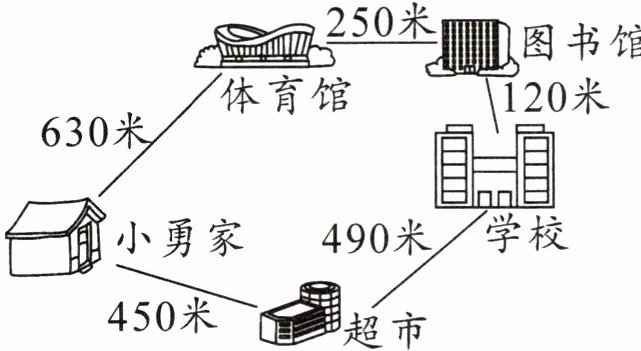 3.小勇家→体育馆→图书馆→学校 630+250+120=1000(米) 1000米=1千米