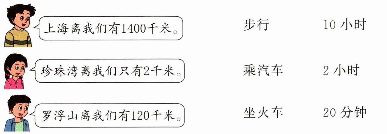 解析根据距离,选择相对应的出行方式以及时间,再连线。1400千米的距离很长,可选择“坐火车”,用时也很长,“10小时”比较合理。2千米的距离较短,选择“步行”比较合理,用时也较短,“20分钟”比较合理。120千米较长,选择“乘汽车”比较合理,用时也较长,“2小时”比较合理。