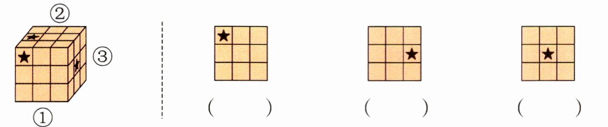 ① ② ③ 解析 可以根据正方体每个面上五角星所在的位置来辨别是在哪个位置看到的。第一幅图,五角星的位置在左上角,应是从①号位观察到的;第二幅图,五角星的位置在中间排最右边,应是从②号位观察到的;第三幅图,五角星的位置在正中间,应是从③号位观察到的。
