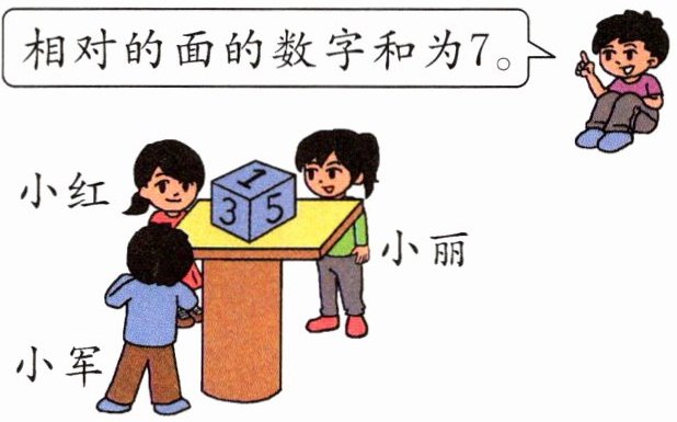 3 4 2 解析 已知相对的面的数字和为7,前面的数字是3,上面的数字是1,右面的数字是5,所以后面的数字是7-3=4,下面的数字是7-1=6,左面的数字是7-5=2。从小军的位置看到的是骰子前面的数字3,从小丽的位置看到的是骰子后面的数字4,从小红的位置看到的是骰子左边的数字2。