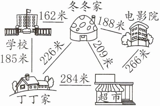 2.星期六上午,丁丁从家出发去找冬冬,他们约好先一起去看电影,再去超市买乒乓球,然后回家。丁丁这天一共走了多少米?