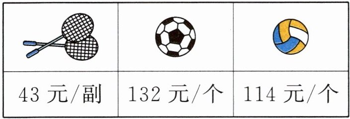 (1)要求买2副羽毛球拍要用多少钱,就是要求2个43元是多少,用乘法计算,即43×2=86(元)。