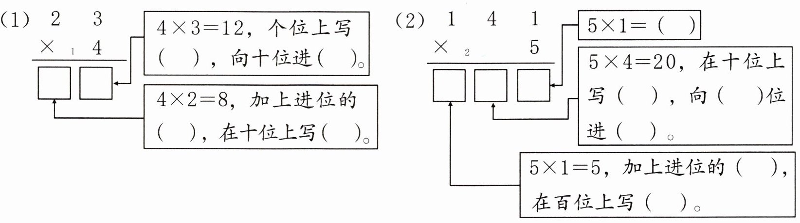 解析 多位数乘一位数,从个位乘起,哪一位上乘得的积满几十就向前一位进几。本位乘完所得的积加上后一位的进位数,才是这一位上的积。
