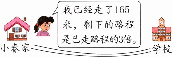 3.165×3=495(米) 解析 要求还要走多少米才能到学校,也是求剩下的路程是多少,就是要求3个165是多少,用乘法计算,即165×3=495(米)。