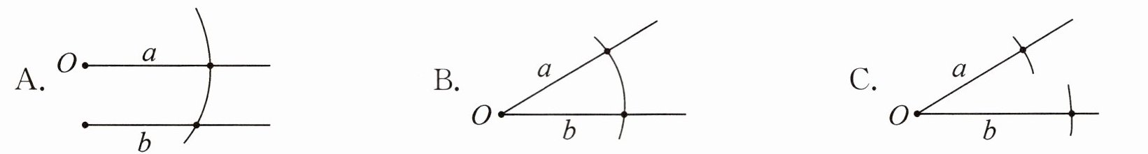 2. 将圆规有针尖的脚固定在点 O,转动手柄画图,它与射线相交形成线段 a、b。下列选项中,线段 a、b 的长度一定相等的是( )。(选一选)