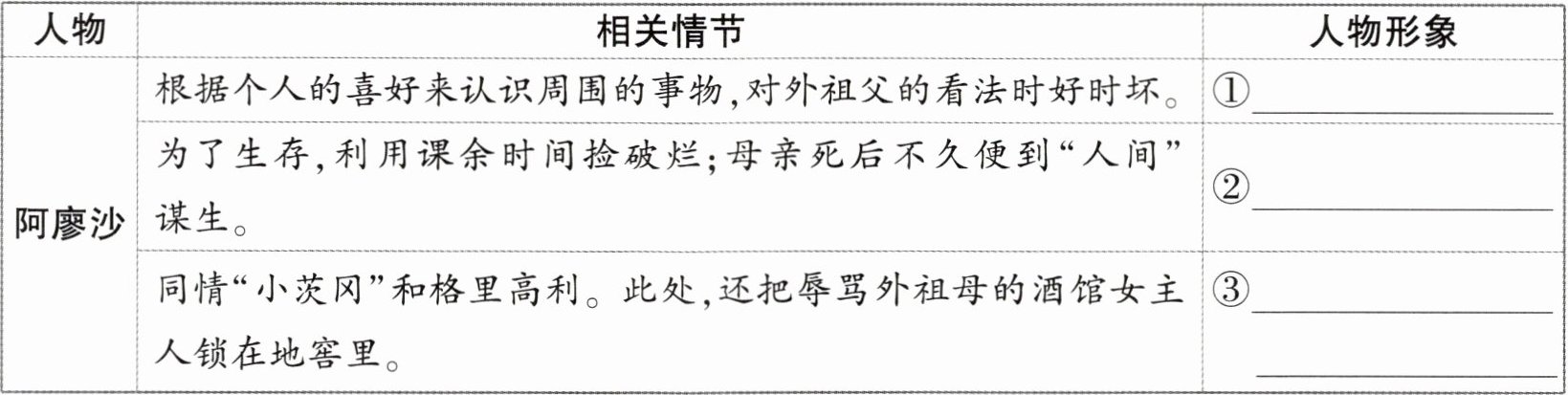 一、奇奇为大家梳理了《童年》中与阿廖沙相关的情节,请你补全阿廖沙的人物形象。