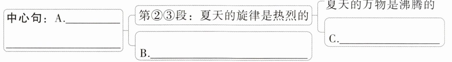 1. (信息提取)选文是从哪些方面描述“夏天的旋律”的?请思考分析并补全下图。(3分)(语文要素:体会文章是怎样围绕中心意思来写的)