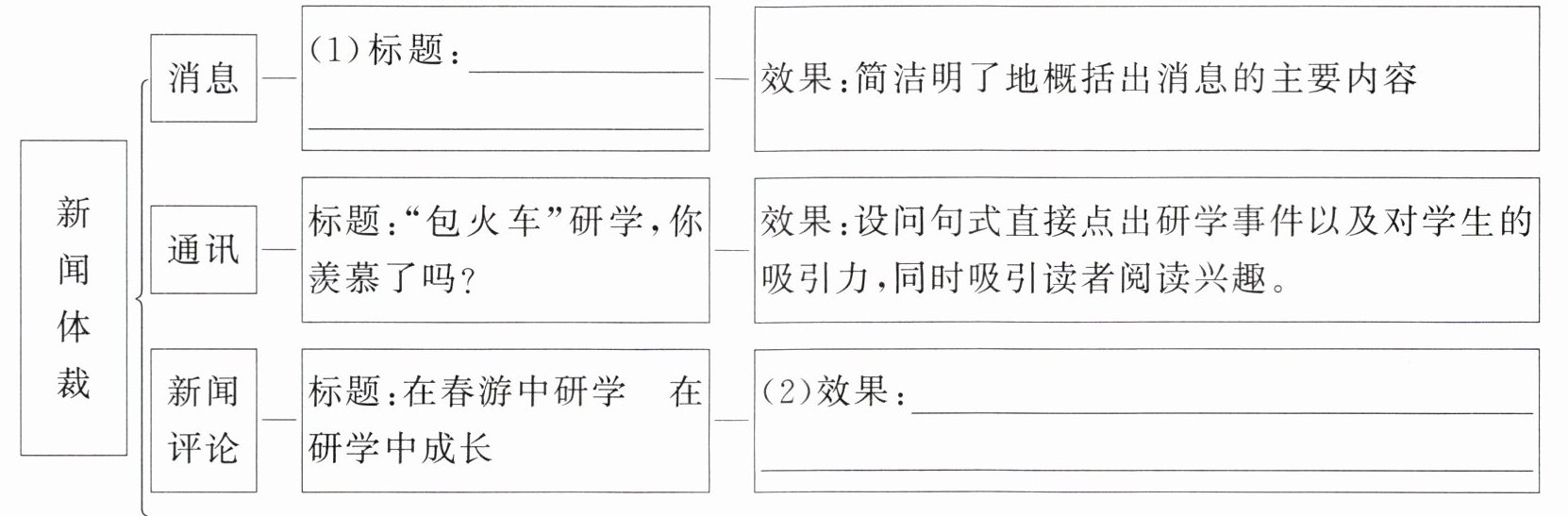 8.材料一、二、三以不同的新闻体裁报道了与研学有关的内容,请你梳理完成思维导图。