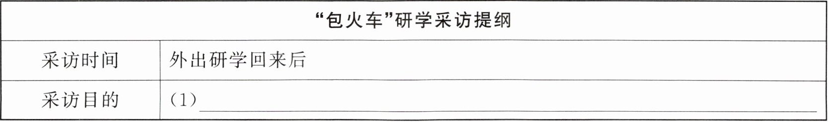 (2)示例一:采访校长 问题1:校长您好,此次研学为什么要选择坐火车出行?问题2:您认为这次活动对学校的整体教育理念和未来发展有哪些积极意义?示例二:采访老师 问题1:老师您好,您认为研学和传统课堂教学最大的不同是什么?问题2:您认为研学活动对学生的未来发展有哪些积极意义?示例三:采访学生 问题1:同学你好,本次研学活动中你最喜欢哪个环节?问题2:本次研学之旅,你最大的收获是什么?