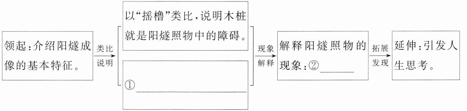 领起:介绍阳燧成像的基本特征。→类比说明→以“摇橹”类比,说明木桩就是阳燧照物中的障碍。①→解释阳燧照物的现象→解释现象:②→拓展延伸:引发人生思考。