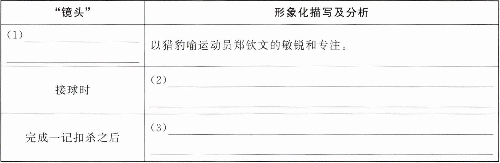9.形象化描写是新闻语言的另一亮点,随着镜头的推进,我们可以更加细节地看到运动员郑钦文打球的全步骤。请根据材料二的内容完成下列表格。