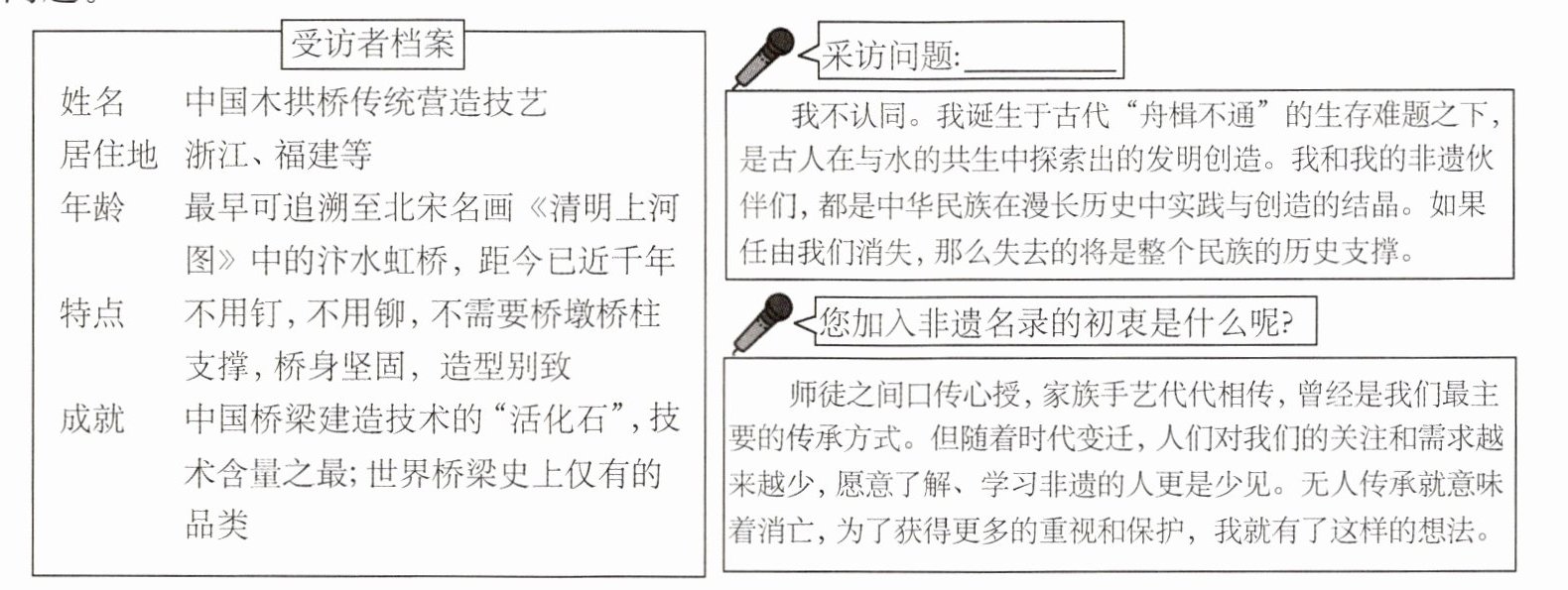7.结合材料一、二,根据受访者“中国木拱桥传统营造技艺”的回答,在下面采访稿中补写出第一个采访问题。