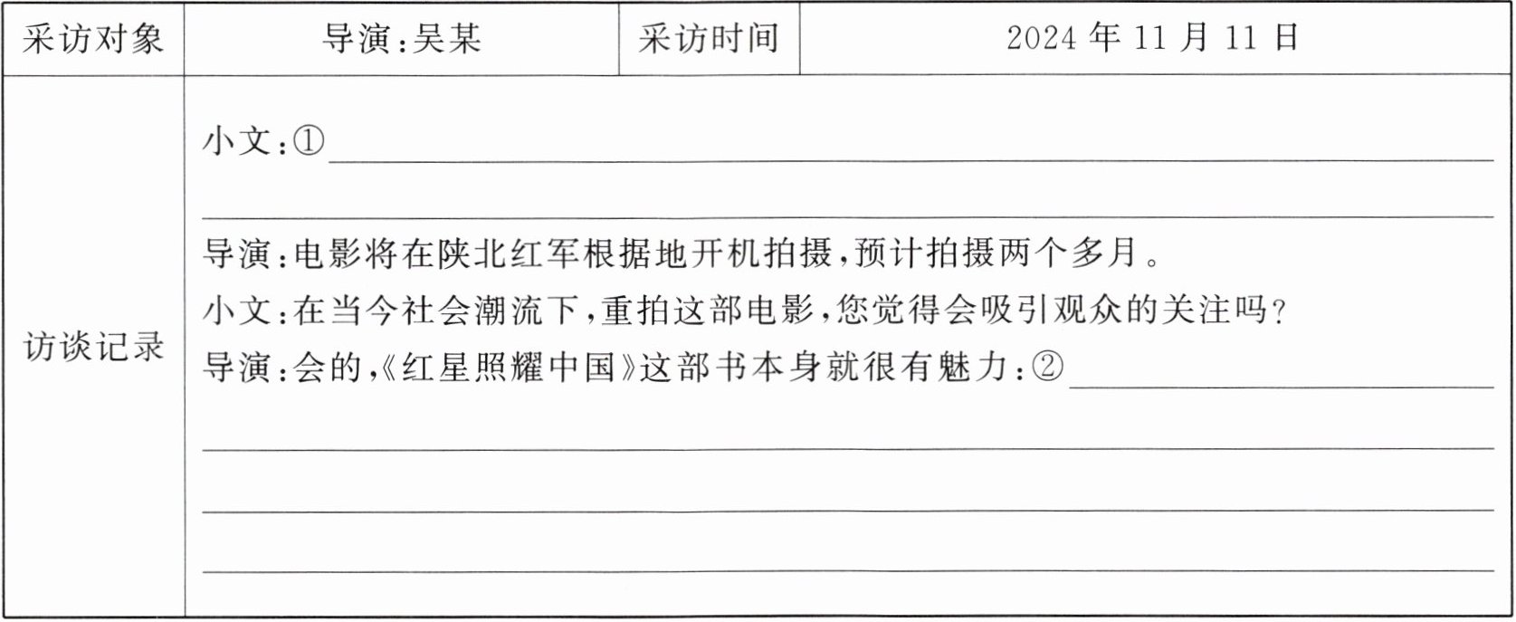 |访谈记录|小文:①______导演:电影将在陕北红军根据地开机拍摄,预计拍摄两个多月。小文:在当今社会潮流下,重拍这部电影,您觉得会吸引观众的关注吗?导演:会的,《红星照耀中国》这本书本身就很有魅力:②______|