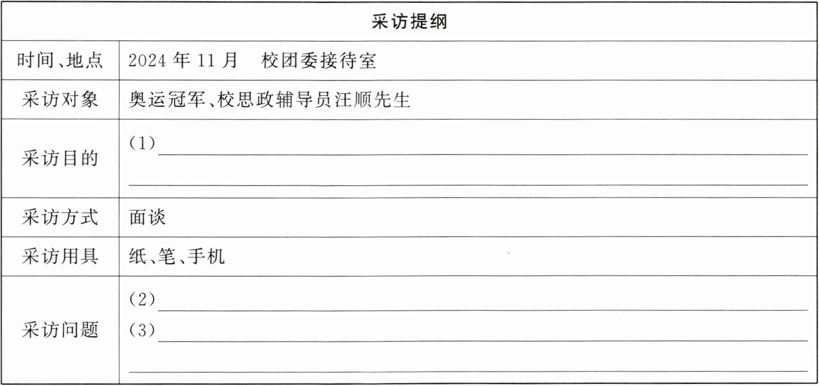 1.近日,上城区体育中心,杭州采荷中学教育集团第35届运动会开幕式,请到一位特殊嘉宾——曾经的东京奥运冠军汪顺。同时他还获得一个新身份——采荷中学教育集团的思政辅导员。学校预组织文学社的成员对本校思政辅导员进行采访,作为文学社的成员,你需要提前拟定采访提纲,请完善下表。