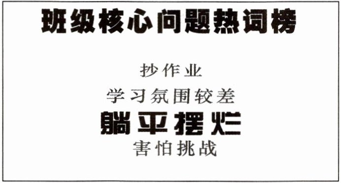 (1)针对下图中反映的班级核心问题,请用一个词语或四字短语制作一条能彰显班级精神的词条(不得选用“自强”或“自强不息”作词条),并说明理由。
