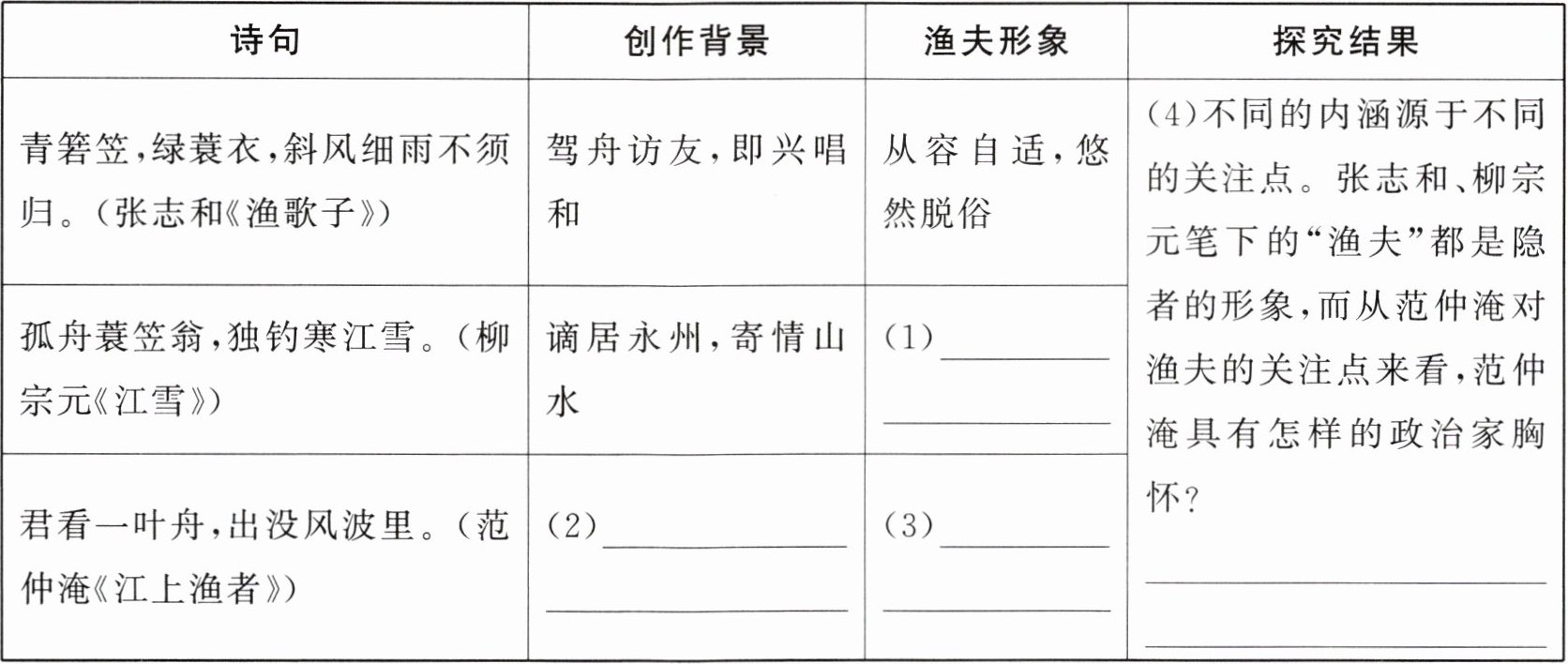 8."渔夫"在中国古代文学中常被赋予隐士的形象,但范仲淹的《江上渔者》里的"渔夫"却另有内涵。请根据提示,将表格补充完整。