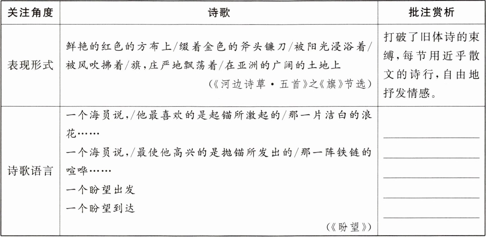 |表现形式|鲜艳的红色的方布上/缀着金色的斧头镰刀/被阳光浸浴着/被风吹拂着/旗,庄严地飘荡着/在亚洲的广阔的土地上(《河边诗草・五首》之《旗》节选)|打破了旧体诗的束缚,每节用近乎散文的诗行,自由地抒发情感。|