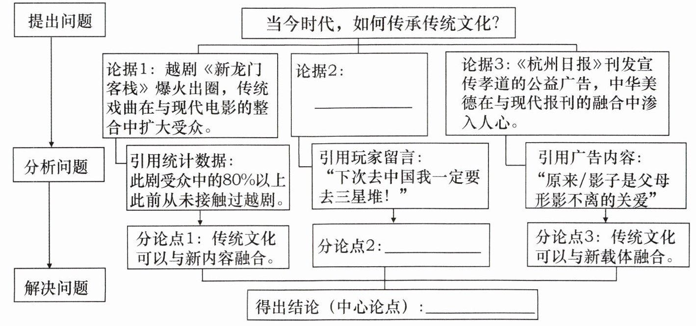 C --> D[论据1: 越剧《新龙门客栈》爆火出圈,传统戏曲在与现代电影的整合中扩大受众。]