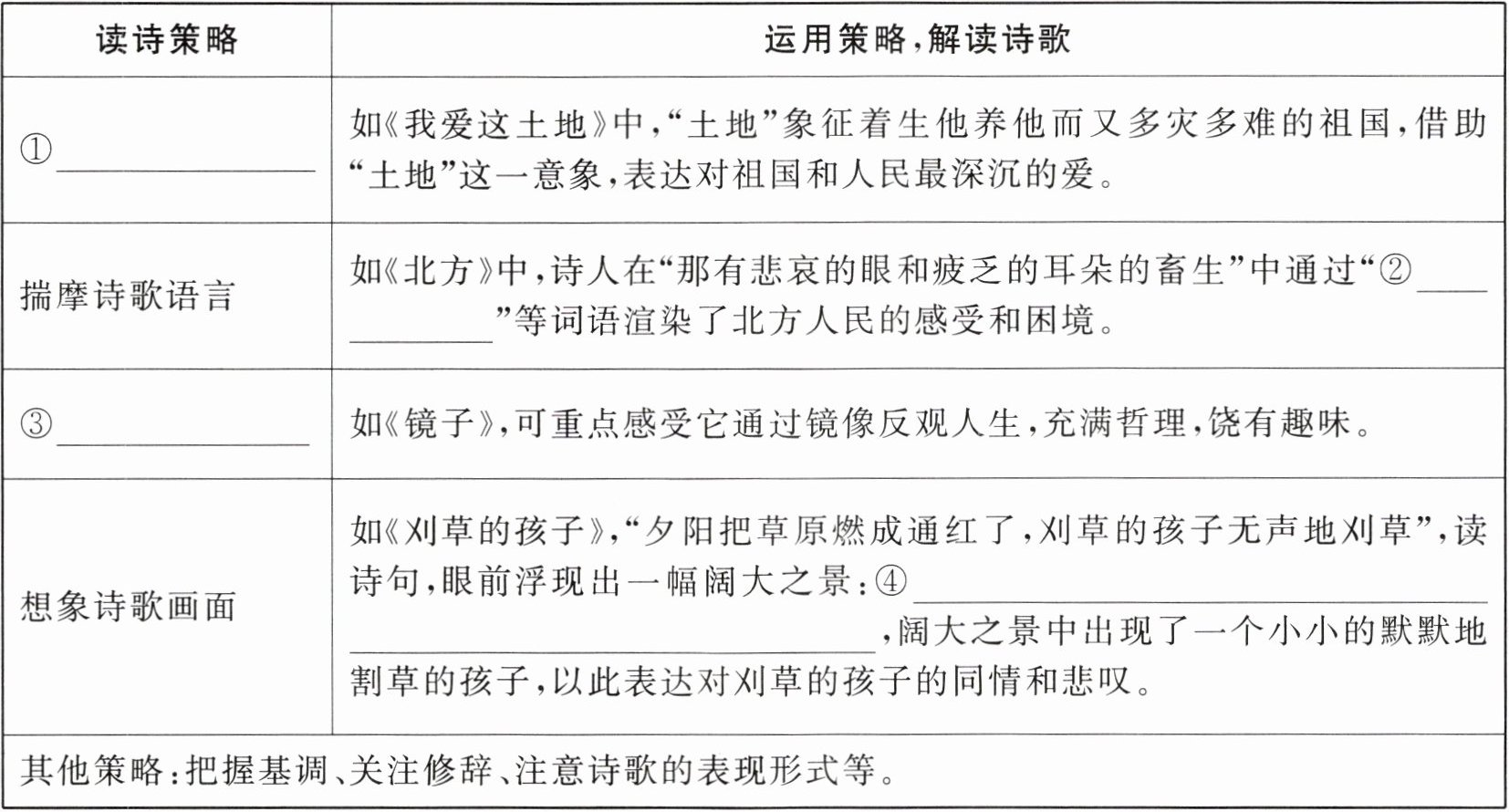 17.示例:方法一:现代诗可以通过反常的词语搭配带来创意美。比如"鹰,鼓着铅色的风"一句,"铅色"与"风"搭配,具有新意。"铅色"让无色无形的风既有了色彩又有了质感,表现出冬日草原上寒风凛冽、万物肃杀的景象,也凸显出了鹰的勇猛。方法二:现代诗可以通过新奇的修辞带来创意美。比如"寒冷/自翼鼓上抖落",运用比拟的修辞手法,通过"抖落"一词把"寒冷"这种抽象的感觉具象化,既写出了鹰所处环境的严酷,又体现了其蓬勃顽强的生命力。