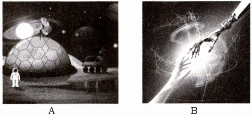 示例一:我选 A。此图中有穿宇航服的人和机器人、太空、星球等内容,能够激发同学们探索未知的兴趣,也符合"发明与创造"的主题。示例二:我选 B。此图中呈现出了人类的手与机械手的"交流",张贴此幅图适合科技馆的环境,也符合"发明与创造"的主题。