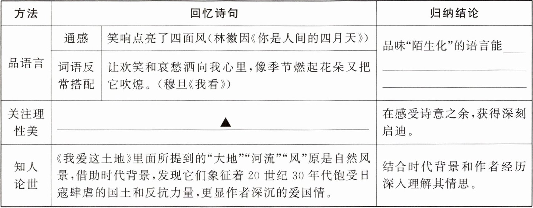 3.根据小文的现代诗歌鉴赏笔记中的表格内容,补全【归纳结论】。