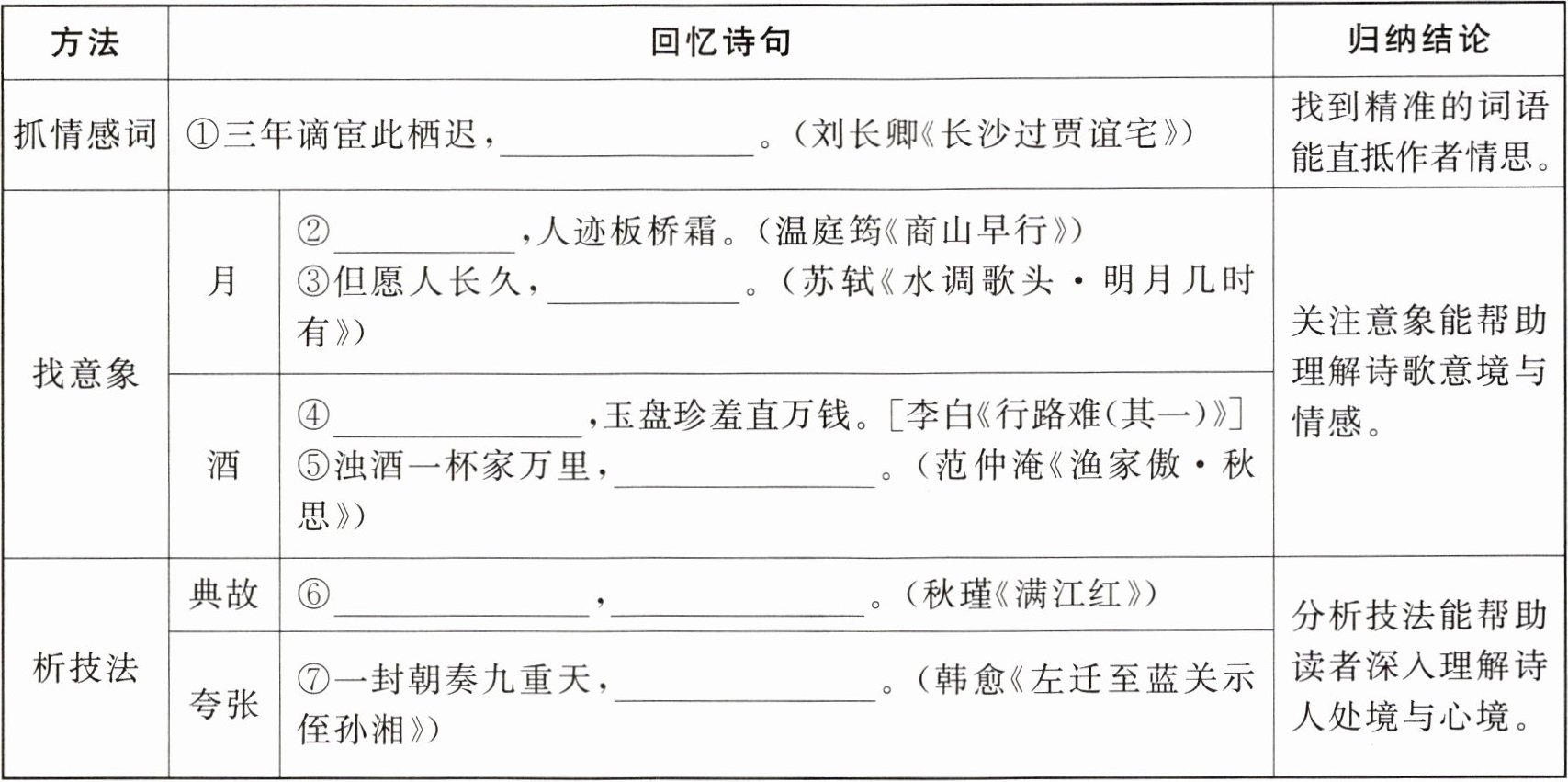 |找意象|月|②______,人迹板桥霜。(温庭筠《商山早行》)③但愿人长久,______。(苏轼《水调歌头・明月几时有》)|关注意象能帮助理解诗歌意境与情感。|