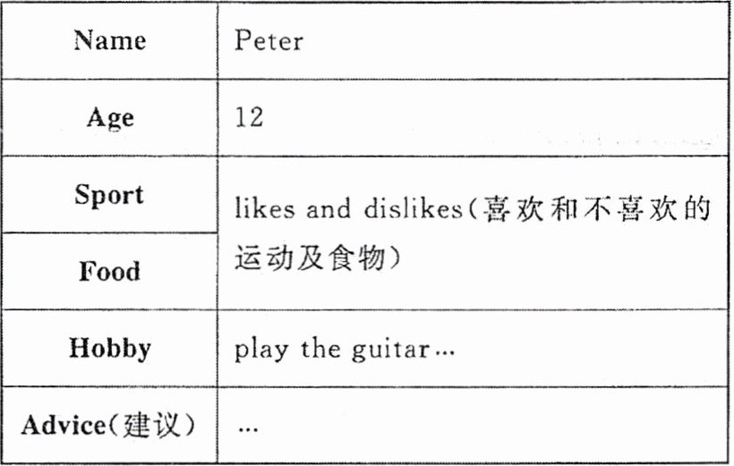 He is 12 years old. His favourite sport is football. He likes playing it with me every weekend. But he doesn't like playing tennis. Because he thinks it's boring. His favourite food is Chinese food, but he doesn't like Mapo tofu. He thinks it's so hot. Peter and I like music a lot. We are both in the school band. We often play the guitar together after school.