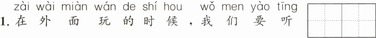 1. 在外面玩的时候,我们要听$\begin{array}{|c|c|}\hline & \\\hline\end{array}$\begin{array}{|c|c|}\hline & \\\hline $dà ren的话。
