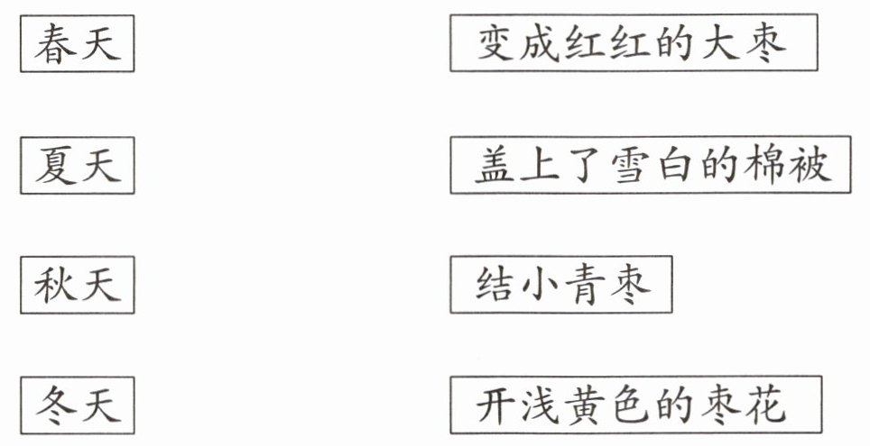 春天,枣树上开满了浅黄色的枣花。夏天,花落了,枣树上结满了小青枣。到了秋天,小青
