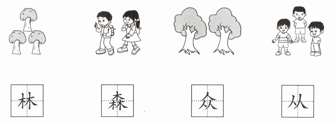 第一幅图连“森”;第二幅图连“从”;第三幅图连“林”;第四幅图连“众”。