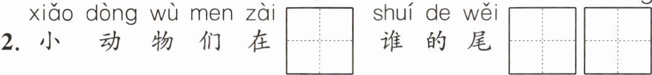 2. 小动物们在$\begin{array}{|c|c|c|c|} \hline & & & \\ \hline \end{array}\begin{array}{|c|c|c|c|} \hline & & & \\ \hline bǐ $谁的尾$\begin{array}{|c|c|c|c|} \hline & & & \\ \hline \end{array}\begin{array}{|c|c|c|c|} \hline & & & \\ \hline ba \begin{array}{|c|c|c|c|} \hline & & & \\ \hline \end{array}\begin{array}{|c|c|c|c|} \hline & & & \\ \hline cháng 。$