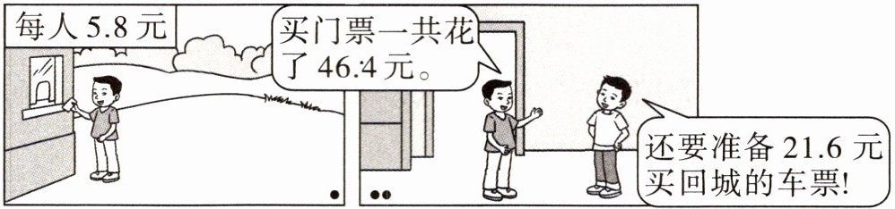 1. 科技小组有多少名同学? 46.4÷5.8=8(名) 2. 一张车票多少钱? 21.6÷8=2.7(元) (答案不唯一)
