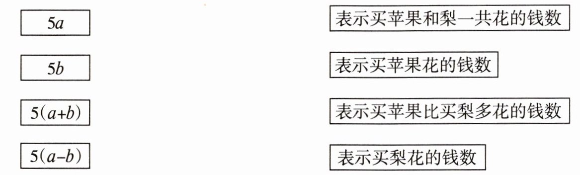 |5a|表示买苹果花的钱数 |5b|表示买梨花的钱数 |5(a + b)|表示买苹果和梨一共花的钱数 |5(a - b)|表示买苹果比买梨多花的钱数