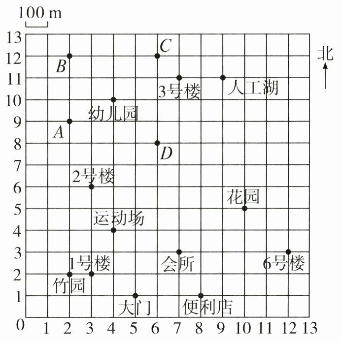1. 便利店$(8,1)$ 人工湖$(9,11)$ 花园$(10,5)$ 运动场$(4,4)$ 竹园$(2,2)$ 会所$(7,3)$