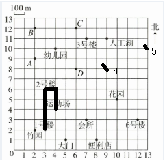 5. 3号楼在会所的( )面,运动场的( )方向是竹园。儿童乐园在幼儿园的西北方向,图上A、B、C、D四个点,点( )是儿童乐园的位置。