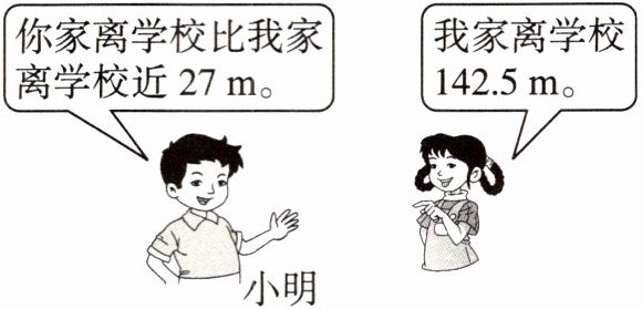 解:设小明家离学校x m。x-27=142.5 x=169.5 答:小明家离学校169.5 m。