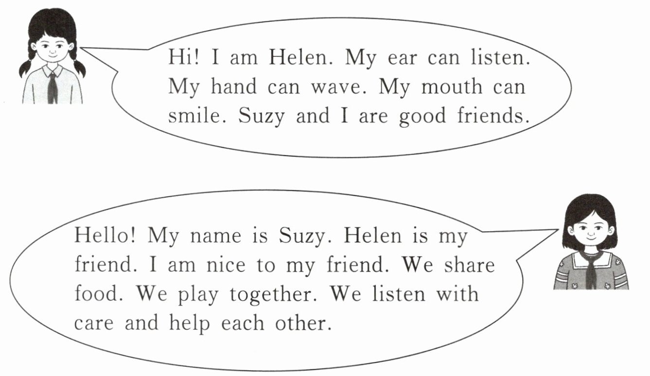 Hello! My name is Suzy. Helen is my friend. I am nice to my friend. We share food. We play together. We listen with care and help each other.