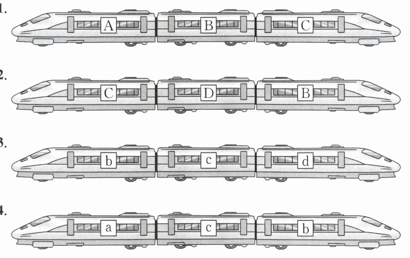 Ⅳ. Look and judge. (按字母表的顺序正确排列的小火车才能启动。下列哪些小火车可以启动呢?能启动的打“√”,不能启动的打“×”。)