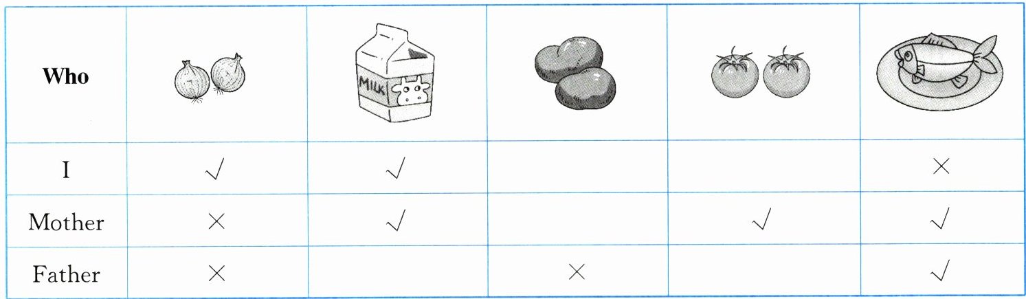 Ⅷ. Read and write.(看图填空,“√”表示喜欢,“×”表示不喜欢。)